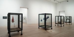 In one of these Cells, titled Spider (1997), several key motifs and concerns are brought together. The spider is architectural in scale: its body merges with the roof of the mesh cage of the Cell, while each of its skilfully articulated, sinewy steel legs extend beyond it. (13) In critic and theorist Mieke Bal’s words, the enormous legs become ‘a skeleton of the house’ and ‘having become architectural in size, they become architectural in essence: the body is a building.’ (14) In Spider, the arachnid’s body appears to be in possession of – or protecting – the Cell’s contents, the focus of which is a low empty chair covered with a worn piece of tapestry. Other tapestry fragments – some featuring body parts including feet, as well as a nude cherub figure with its genitals snipped out – partially cover the Cell walls, while an elongated black rubber sculpture hangs from an inside wall, acting as a pincushion for large needles and a safety pin holding coins and other lucky charms. Suspended from the ceiling are chains with various trinkets attached: a pocket watch, locket, medal and a bottle of Shalimar perfume. The spider’s body, filled with glass eggs, extends through the centre of the Cell’s roof. In Spider, Bourgeois conjures a dramatic scenario inflected with and enlivened by autobiographical references, specifically to her mother, the ‘useful spider’ and careful restorer of damaged tapestries.