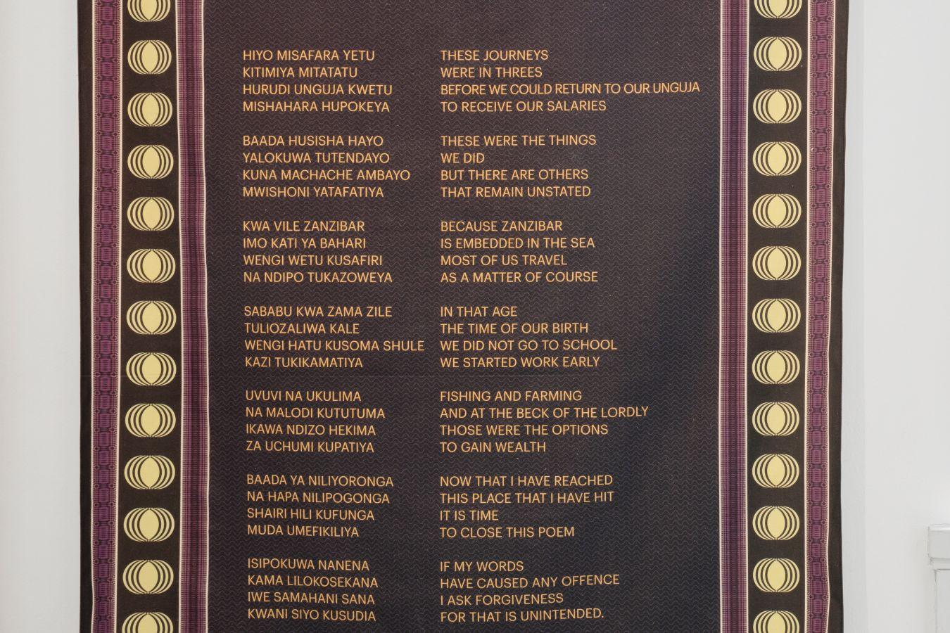 Ginwala: Thinking about orality since we’re addressing erasures, systemic erasures – we’ve also been referencing music and sonic practices in the exhibition. Of course, in my orbit a lot of that also came through Bonaventure Soh Bejeng Ndikung, who is the co-conspirator of this project, but also through you, Yvonne. One of the places that we all have now been to is the Dhow CountriesMusic Academy in Zanzibar, which is a major centre to preserve the knowledge of Taarab music, of Kidumbak, of Ngoma and so forth. There is a special mix that was created with students and teachers of the Dhow Countries Music Academy of a track called ‘Pakistan’. It was recorded in Bombay for the first time, but this particular mix was sung in Zanzibar, in Stone Town. So, it is really messing with the geopolitical pressures, it does this incredible sonic circuit – the song ruptures the notion of the nation as a singular space and turns it into lyric. It is also sung in a way that it is passed on in a matrilineal way. Originally, it was composed by Siti binti Saad [3]. When I heard it, it was sung by Siti Muharam, who is her great granddaughter. It would be great to discuss the sonic legacy that really is bleed into your work, whether it’s your documentary, dear John, or your writing or the atmosphere in which you breathe in Stone Town while you are imagining the writing that is to come, dear Yvonne.
