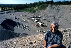 Holt at the site of the construction of her earthwork Up and Under, built in an abandoned sand quarry in Nokia, Finland, 1998