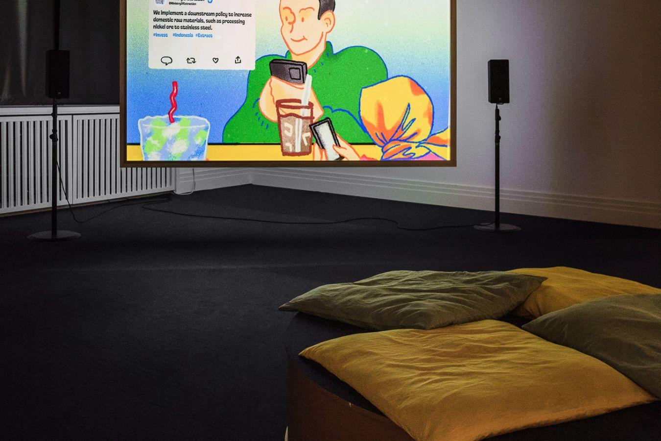 “Invest in Indonesia / make sure that you don’t miss it!” goes the refrain of a song featured in Köken Ergun’s China, Beijing, I Love You! (2023). The newly-commissioned film is an animation that charts with documentary rigour the network of sea routes known as the Maritime Silk Road, which services the extractive economies of rare earths between Indonesia, China and the Democratic Republic of Congo. Essential to the production of EV batteries, mobile phones and missile technology, in the film Nickel and Cobalt are metals-turned-characters who face extraction and exile through Afrasian networks of profit and consumption. While a group of suited-up men tout investment as the way forward to national prosperity, the grievances of Nickel are echoed by the political unrest of workers in processing plants, who protest for better working conditions, environmental protection and health safeguards. Along with the plea of Nickel to be returned to the ground where she belongs, ecological depletion and health hazard are reminders that different forms of planetary cohesion are needed in the Indian Ocean world.
