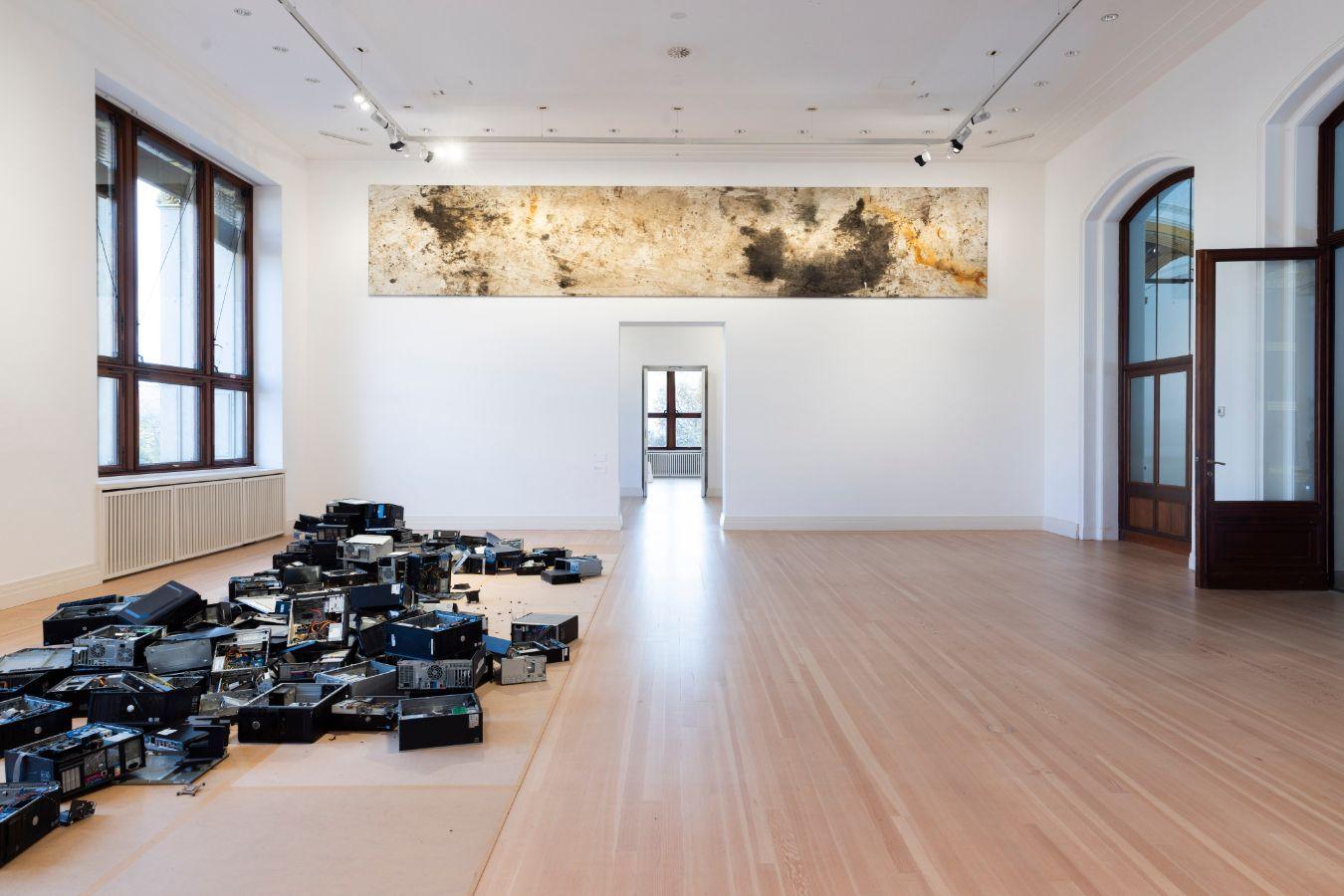 Elders: Yes, I’m very interested in this power of transformation in your work. In your practice, we witness how you make what you find on the scrapyards into art; how you bring dirt into the museum as a huge, monumental object – almost like a work by a male, American Abstract Expressionist painter – and exhibit it here, in the gallery space. I often thought about this force of transformation when we were making this presentation, which was supposed to be a one-time performance. Then, we thought about how we wanted to show all elements of your practice in these amazing spaces: all the disciplines, all the approaches, all the ways of working. It’s sculpture, it’s painting, it’s drawing, it’s video, it’s documentary. And, of course, it’s very performative as well. It’s so much. Your mother’s and father’s practices are here, too, in a way; your work evokes how they survive and how their labour lives on in an exclusive, elitist art space. How do you think about it?
