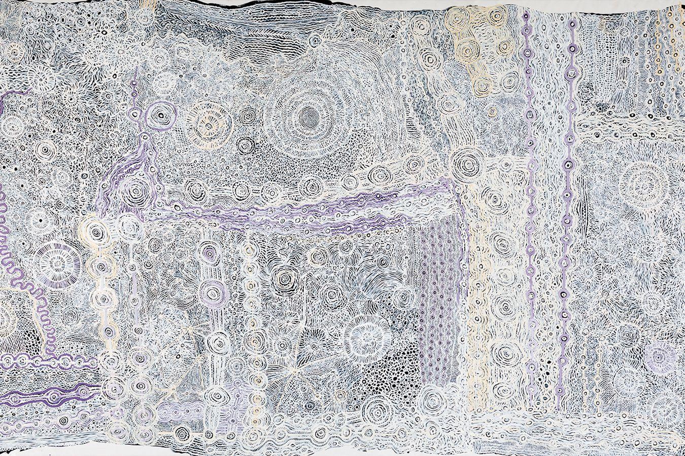 Ngangkari Ngura (Healing Country) (2021) ist ein gemeinsames Gemälde von zwei respektierten Pitjantjatjara Künstlerinnen. Betty Muffler und Maringka Burton arbeiten bei Iwantja Arts in der kleinen Anangu Community in Indulkana, Anangu Pitjantjatjara Yankunytjatjara (APY Gebiet) in Südaustralien und sind Ngangkari, traditionelle Heilerinnen. Ngangkari sind hoch angesehen und kümmern sich seit Tausenden von Jahren um die körperliche und emotionale Gesundheit der Menschen.