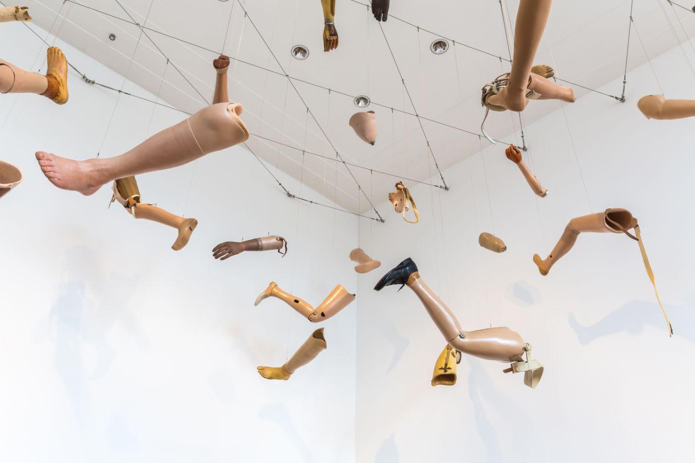 Kader Attias On Silence (2021) richtet sich gegen die Zurückhaltung und Verdrängung politischer Gewalt, indem es sichtbar macht, was oft ungesagt übergangen wird. Diese prothetischen Gliedmaßen zeigen ihre individuellen Narben, Nähte und Säume. Abgetrennt von den Körpern, die sie stützten, spiegeln die Prothesen das Gedächtnis der Menschen wider, von denen sie ein Teil waren. Sie sind zu symbolischen, nicht-organischen Überresten geworden. Sie erinnern an die Wunden, die sie einst wieder gutgemacht haben, und an den Schmerz, den sie linderten. Die Installation verkörpert physische und psychische Traumata in einem Verständnis von Reparatur als Prozess des Erinnerns statt des Auslöschens.