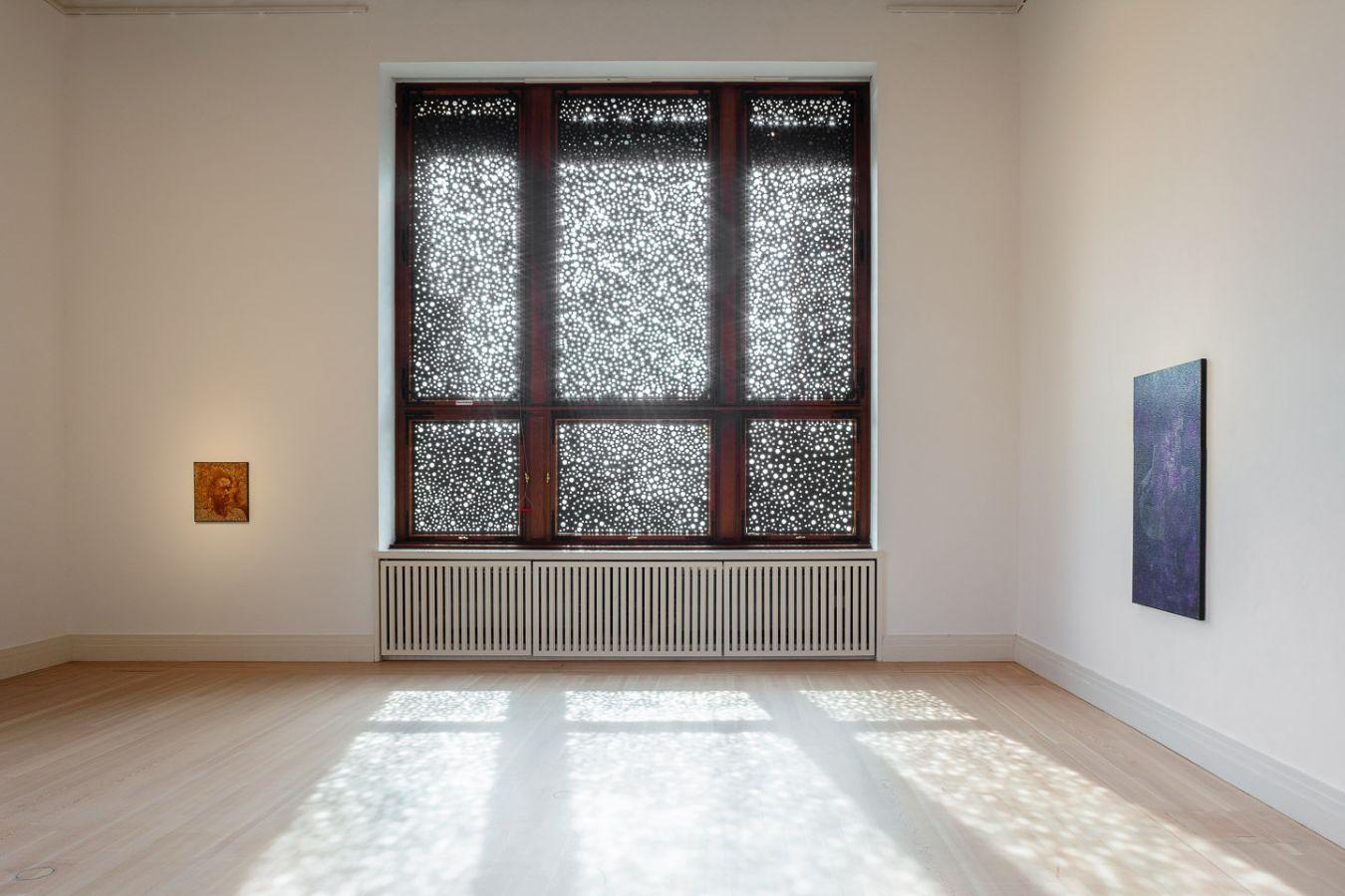 Boyd übertrug seine Maltechnik auf die Fenster des Gropius Bau. Die Löcher in der Folienoberfläche verdeutlichten den Unterschied zwischen Helligkeit und Dunkelheit. Sie dienten als Schwelle, die das Licht brach und den Raum in ständige Bewegung versetzte.