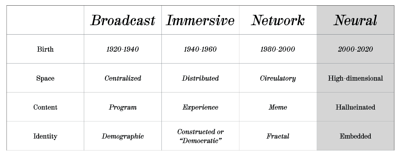 Folgen wir dem oben beschriebenen Dreißig-Jahres-Zyklus der Medientypen, können wir davon ausgehen, dass wir uns in der Frühphase der neuronalen Medien befinden – und dass sie sich noch einige Jahrzehnte weiterentwickeln werden, bevor sie zu etwas Neuem mutieren. Ich habe mich hier auf KI konzentriert, jedoch den Begriff „neuronale Medien“ gewählt, damit dieser Typus auf Gehirn-Computer-Schnittstellen und anderen Medientypen ausgeweitet werden kann, die auf neuronalen Strukturen und neuronalen Netzwerken basieren.