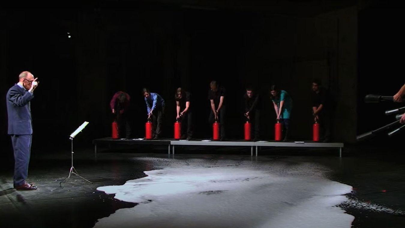 Mit fünfzehn Feuerlöschern und den sich daraus ergebenden geräuschhaften Parametern wird eine szenisch-konzertante Aufführung inszeniert.