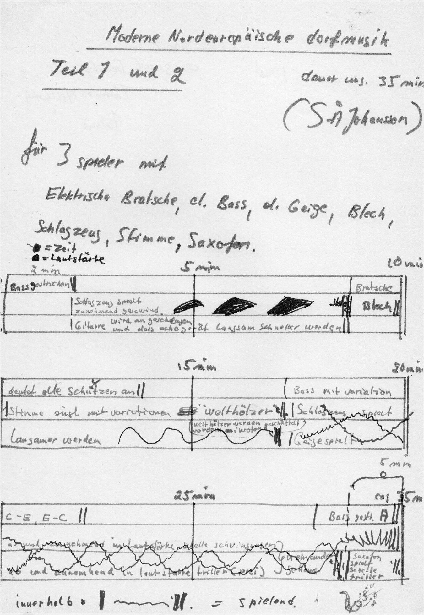 ich sven-åke johansson (43 mariestad schweden) fing an als kind auf den kochtöpfen und deckeln meiner mutter zu spielen später auf gefundenen blecheimern die ich zusammenbaute als eine art schlagzeug als basstrommel hat damals ein abgesägtes weintraubenfass gedient ich habe darauf gespielt und dabei die damaligen schlager gesungen (im keller vom elternhaus) victoria victoria que sera sera usw erster öffentlicher auftritt zuzammen mit einem in der kleinstadt berühmten accordionspieler auf einer von meinvaters geburtstagsfeten habe von einem freund eine wirbeltrommel gekauft spielte im blasorkester basstrommel später schulband jazz (vorbilder c. braun max roach j.j. johnsson) spielten manchmal zu tanz in der turnhalle vom gymnasium it’s sand man gertrudes bounce bohemia after dark und die tanzten inzwischen einundhalb jahre als werkzeugmacherlehrling gearbeitet spielte nachher (fast profi) in tanzorkestern in die nachbarstadt skövde bosse skoglunds sextett (swing und schlager) i can’t believe that you are in love with me twist twist im sommer draussen auf schützenfesten habe in kellern und kleinen zimmern gehockt fuhr manchmal nach göteborg und stockholm um was besonderes zu hören und sehen übte immer nach platten jazzstücke in den von mir und l. pettersson aufgemachten jazzklubb galaxy im keller vom alten landesregierungsgebäude in mariestad die provinz war mir zu wenig zog nach stockholm zu erst in dem zimmer von einem tenor saxofonist freund aus skövde h. gustavsson spielte abends schnultzen im tanzrestaurant corso auf sveavägen (viel südamerikanische stücke) fuhr auf tournee durch norrland und finland mit kent silver and the silverstars in finland mussten wir immer jeden zweiten tanz tango spielen sonst gabs stunk kam nach deutschland spielte jazz im restaurant in munster mit gerold flasse und uwe wegener traf elin sprach nur englisch 25 dm und drei bier am tag abends nur ein paar paare rot plysch und fis fuhr nach schweden västerås bildete zuzammen mit bobo stensson ivar lindell und gunnar fors ein kvartett spielten nicht mehr zum tanz (leider) nur konzerte milestones immer wieder fing an mit tonbändern und klängen zu spielen führte im pistolteatern und rundfunk das licht und klangstück alphaville auf