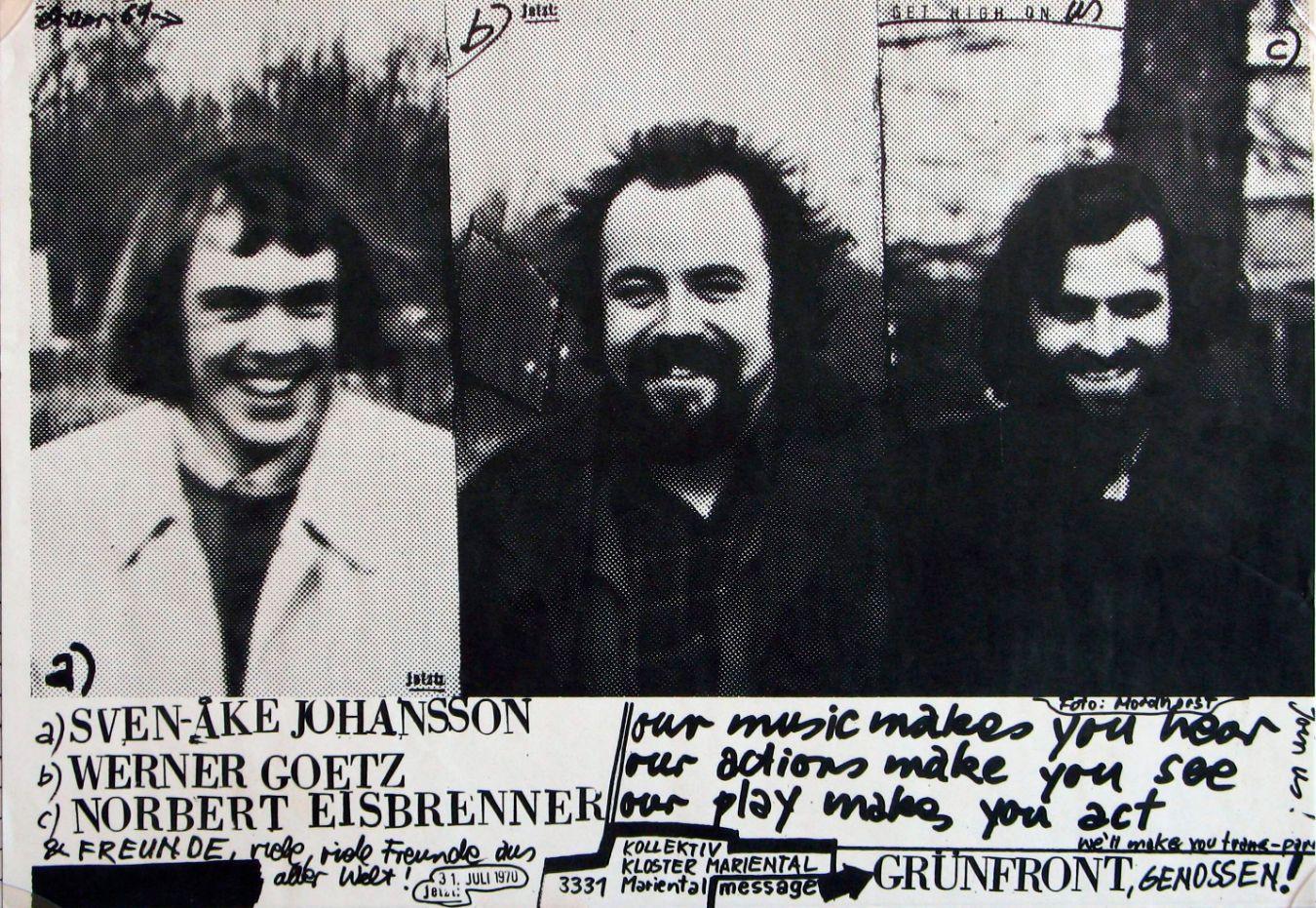 war oft knapp hilfe kam oft von meinen eltern die mir geld geschickt haben trug meistens manchesterkleider spielte gleichzeitig in lasse nilssons bigband basiestücke cute lil darling paris le chat qui peche fuhr immer mit ein dreirädiges moped mit ladefläche rum mit dem schalgzeug drauf traf gunter hampel im blue note s c h w e d e n barcelona jamboree jazz cava g. fors kvartett l. bennet madrid whisky jazzklubb ivar ran blake p. poindexter schrieb viel associative textstücke spielte auf amerikanische basen in frankreich mit daddy schow und heuchlerei i left my heart in san franzisko sonny boy inzwischen aus der musicbox detroit city spielte in antwerpen mit p. brötzmann f. von hove und peter kowald später in mehreren klubs in ganz deutschland mit den sind in münchener jazzdomicil rausgeschmissen worden sprach besser deutsch verliebte mich vie viele in heidelberg berlin zodiak musik is happening norbert eisbrenner werner götz elektrische klänge vibraton weniger ernst publikumsbeteiligungen spielten in irrenhäusern bin seit längerer zeit auf dem lande in mariental bei helmstedt habe mit götz und eisbrenner die moderne nordeuropäische dorfmusik immer noch in irrenhäusern stadtmusik 1–4 gefängnisse schulen musiktherapie mit kindern konserte wollen in altersheimen versuchen augenfarbe blau–grau–grün