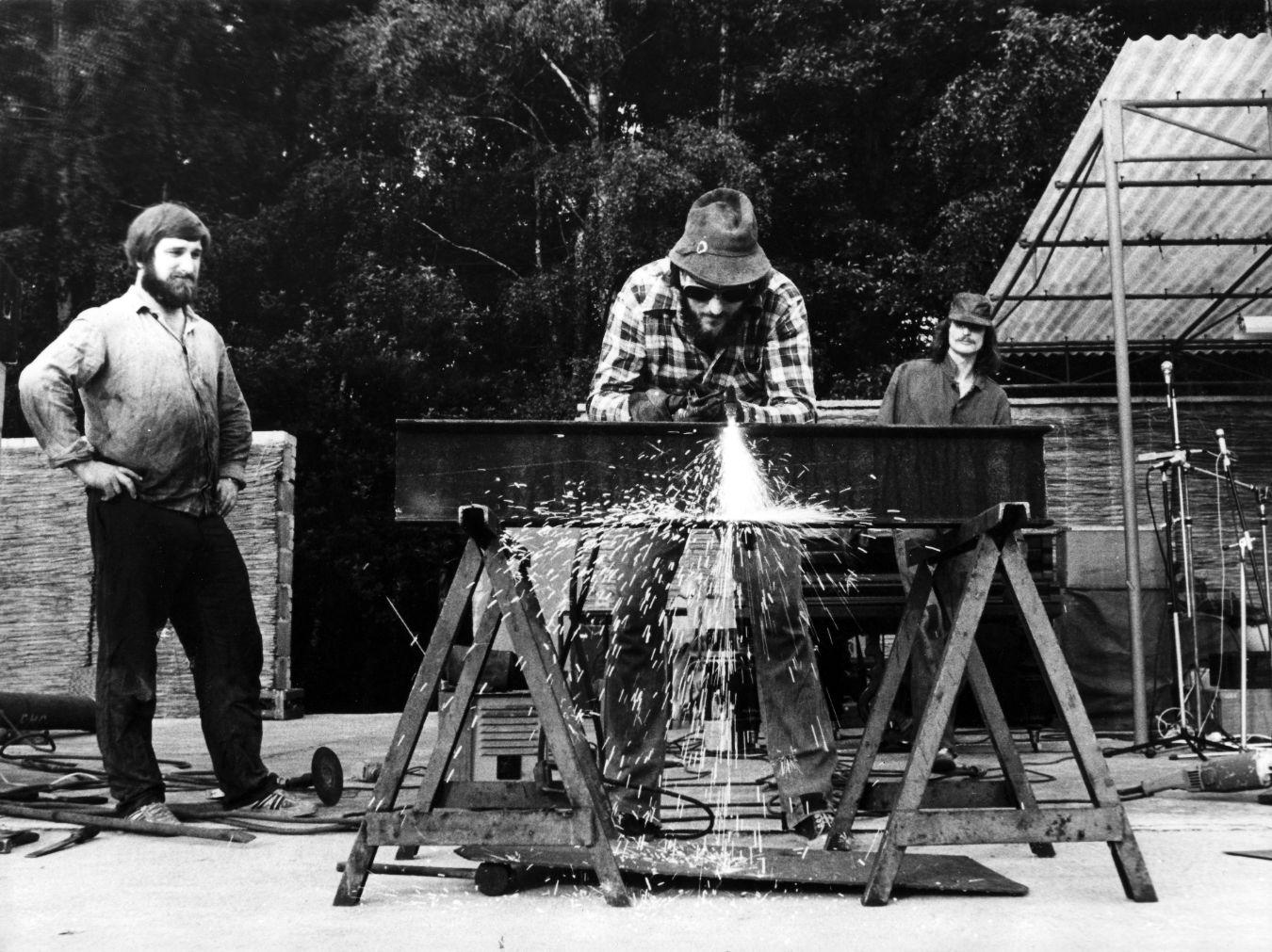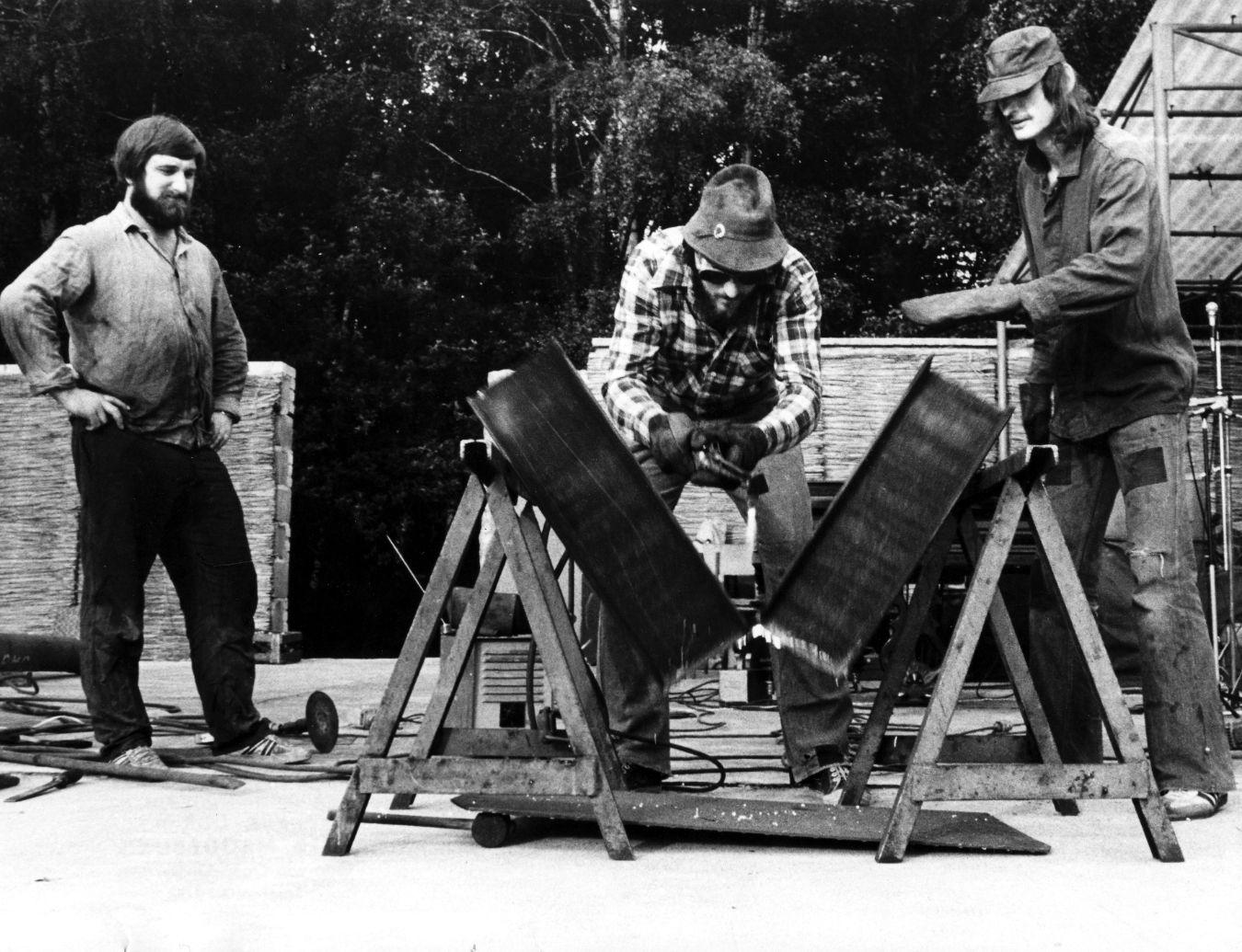 Das Projekt ist mit vielen Vorbereitungen, Transport- und Aufstellungsarbeiten verbunden. Open-Air-Festival Peitz (Brandenburg, DDR), 1979.